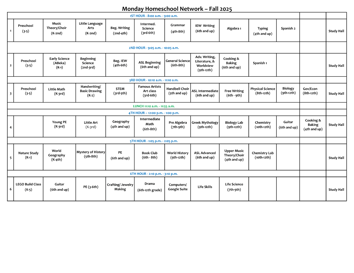 Our mission is to provide Christ- centered support, community, and guidance for homeschooling families who desire accountability and structure that regular class work provides. Students who intend to transition from homeschooling directly to college need experience in meeting class requirements in a timely and competent manner. These classes are not intended to replace homeschooling or to relieve the necessity of parental supervision. Rather, they seek to help provide instruction in areas in which the parent may not have expertise and to provide classroom experience for students who may be unaccustomed to the demands of formal education.Those who participate in MHN have been blessed by the friendships, fellowship, and learning opportunities.
